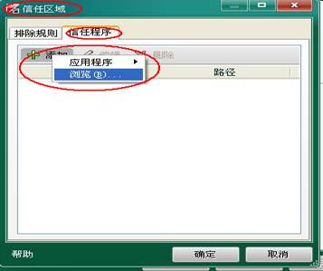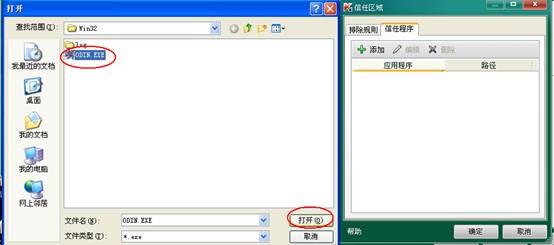 3.在“信任区域”对话框中选择 “信任程序”选项卡,单击“添加”—“浏览” 4.找到 游戏的根目录下的 bin\win32\Odin.exe,并单击“打开”按钮,弹出“排除的应用程序”对话框。