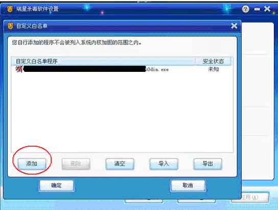2. 在“瑞星杀毒软件设置”窗口中,在左边选择 “电脑防护”—“系统内核加固”并单击 右边 “不检测的程序文件”—“白名单:设置”,如下图: