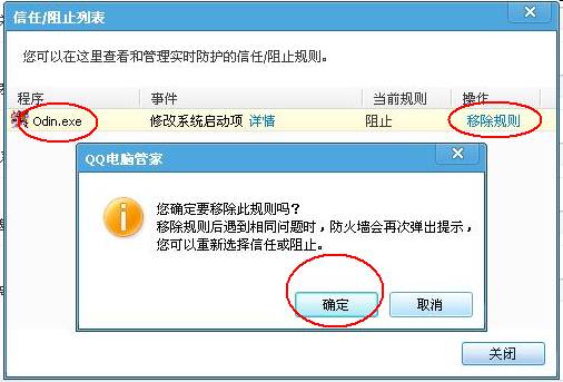 2.在“信任/阻止列表”中找到Odin.exe,并单击“移除规则”,在弹出的提示信息中单击“确定”即可。